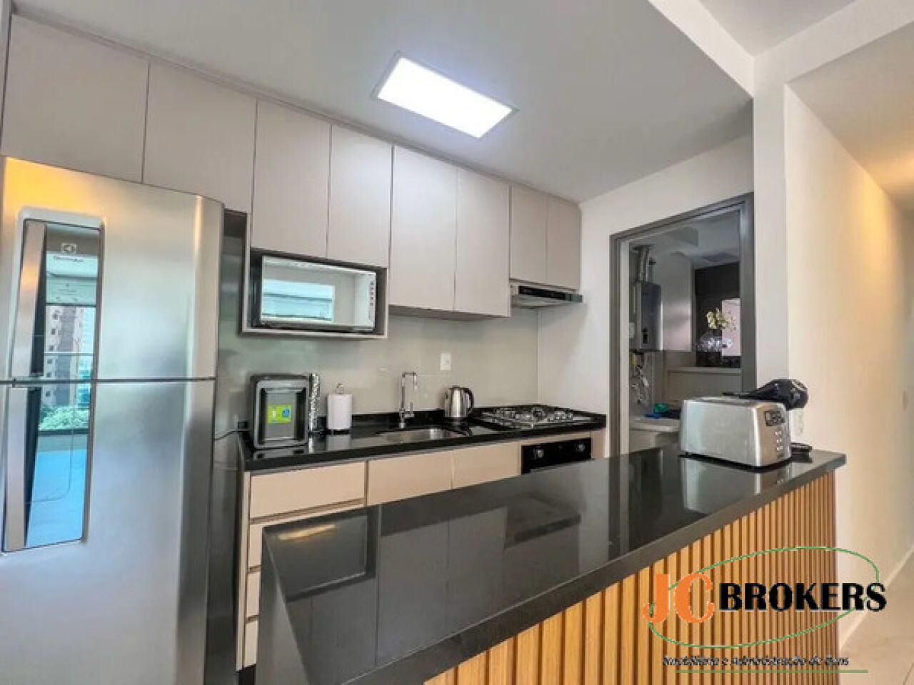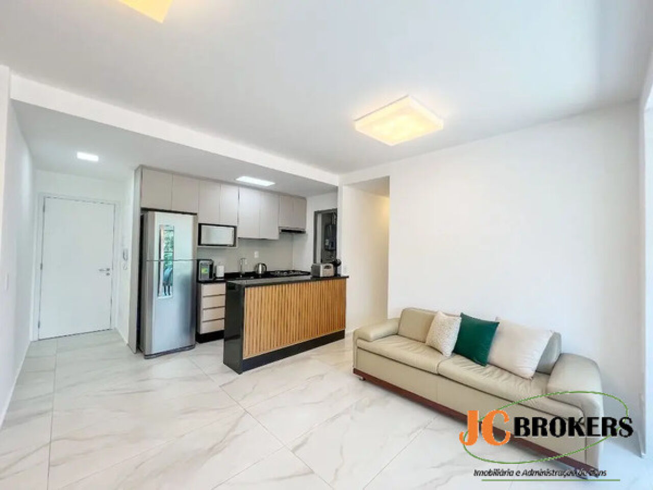 DESCRIÇÃO: Apartamento com 74 m² de área útil, 2 Dormitórios, sendo 2 suítes, Dormitórios com armário embutido, Sala para 2 ambientes com varanda integrada, Ar condicionado na sala e nos dormitórios, Cozinha americana repleta de armários, Lavabo, Área de serviço, 1 Vaga, 3 Banheiros